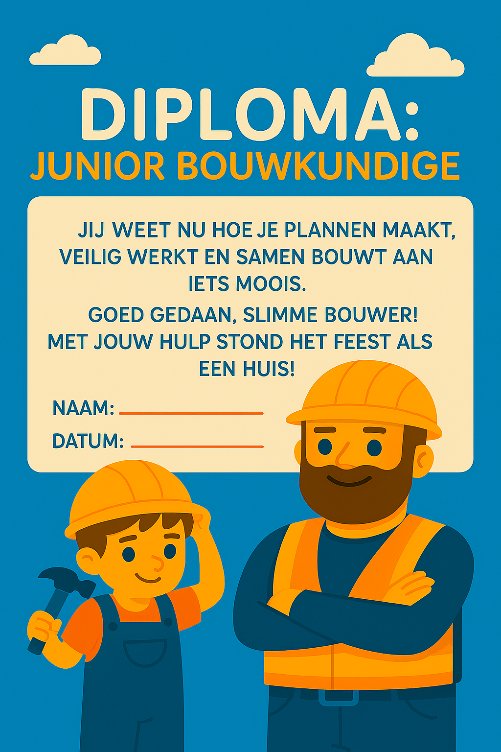 Stap binnen in een wereld vol fantasie en avontuur met “Feestfabel op de bouwplaats”! Dit unieke kinderfeest neemt jonge bouwers mee op een spannende reis langs stoere machines, vrolijke bouwvakkers en creatieve uitdagingen. Samen met Max en oom Peter beleven de kinderen een onvergetelijke dag: ze dragen echte bouwhelmen, helpen de timmerman, lossen het kleurenraadsel van de schilder op, verlenen eerste hulp aan de metselaar en bouwen samen een stevige muur. Elk hoofdstuk van het verhaal is gekoppeld aan een bijpassend spel of activiteit, waardoor de kinderen niet alleen luisteren, maar ook actief meedoen. Van torenbouwen tot cement maken, van broodjes proeven tot een bouwmaterialen-speurtocht: alles draait om samenwerking, plezier en ontdekken. De feestlocatie wordt omgetoverd tot een echte bouwplaats, compleet met decoratie, bouwvakkerslunch en diploma-uitreiking. Zo ontstaat een feest vol herinneringen, waar kinderen én ouders nog lang van nagenieten.